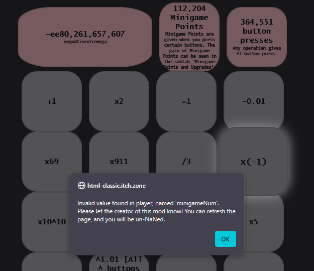 Making the number negative in the minigame after unlocking passive generation causes this error